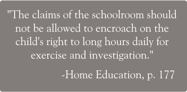 "Five of the thirteen waking hours should be at the disposal of the children; three, at least, of these, from two o'clock to five, for example, should be spent out of doors in all but very bad weather. This is the opportunity for out-of-door work, collecting wild flowers, describing walks and views, etc. (see Home Education). Brisk work and ample leisure and freedom should be the rule of the Home School. The Children's Day will, on the whole, run this: Lessons, 1 1/2 to 4 hours; meals, 2 hours; occupations, 1 to 3 hours; leisure, 5 to 7 hours, according to age. The work not done in its own time should be left undone. Children should not be embarrassed with arrears, and they should have dues sense of the importance of time, and that there is no other time for work not done in its own time. Should the children flag at any time, a day's holiday, a little country excursion, should refresh them." (From Suggestions which accompanied the PNEU Programmes)