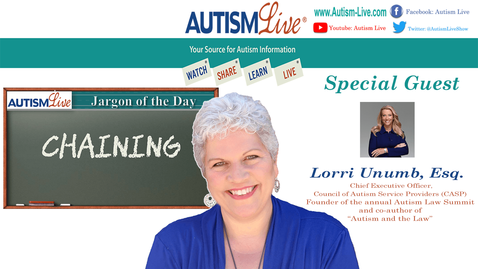 This time on Autism Live, Shannon covers Chaining for the autism jargon of the day before Chief Executive Officer of the Council of Autism Service Providers (CASP) and co-author of \u201cAutism and the Law\u201d, Lorri Unumb joins our host Shannon Penrod! Check it out!