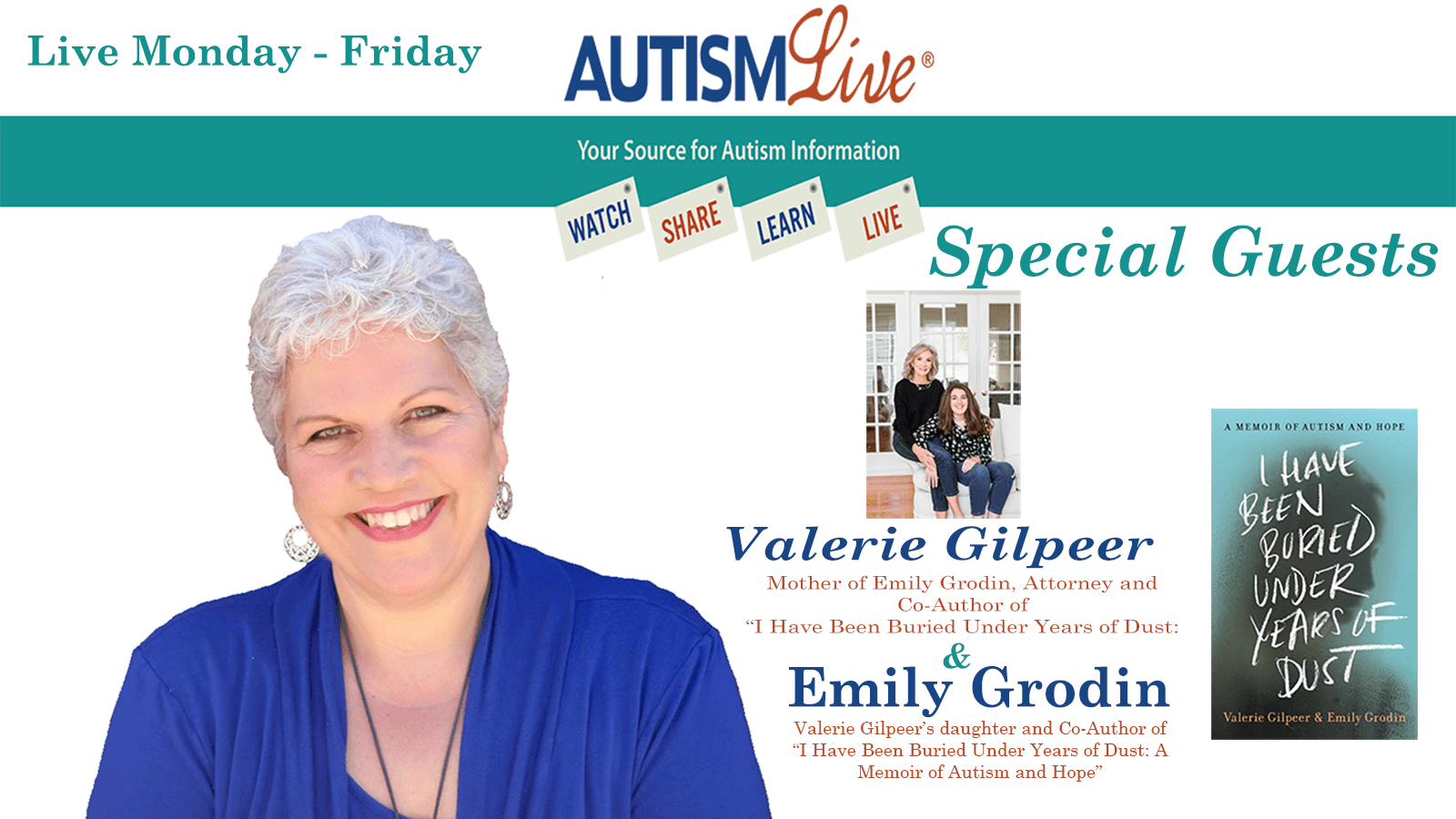 Don't miss this special episode of Autism Live where shannon gets the opportunity to interview the mother and daughter who wrote the very inspiring #1 Best Seller in biographies of people with disabilities on Amazon, Called "I Have Been Burried Under Years of Dust", Valerie Gilpeer and Emily Grodin. This interview not only demonstrates the power of functional communication, but also gives a little insight on what it is like for Emily to communicate with others as well as information on what it was like for Valerie to raise Emily as a nonverbal child on the autism spectrum. Check it out!\xa0