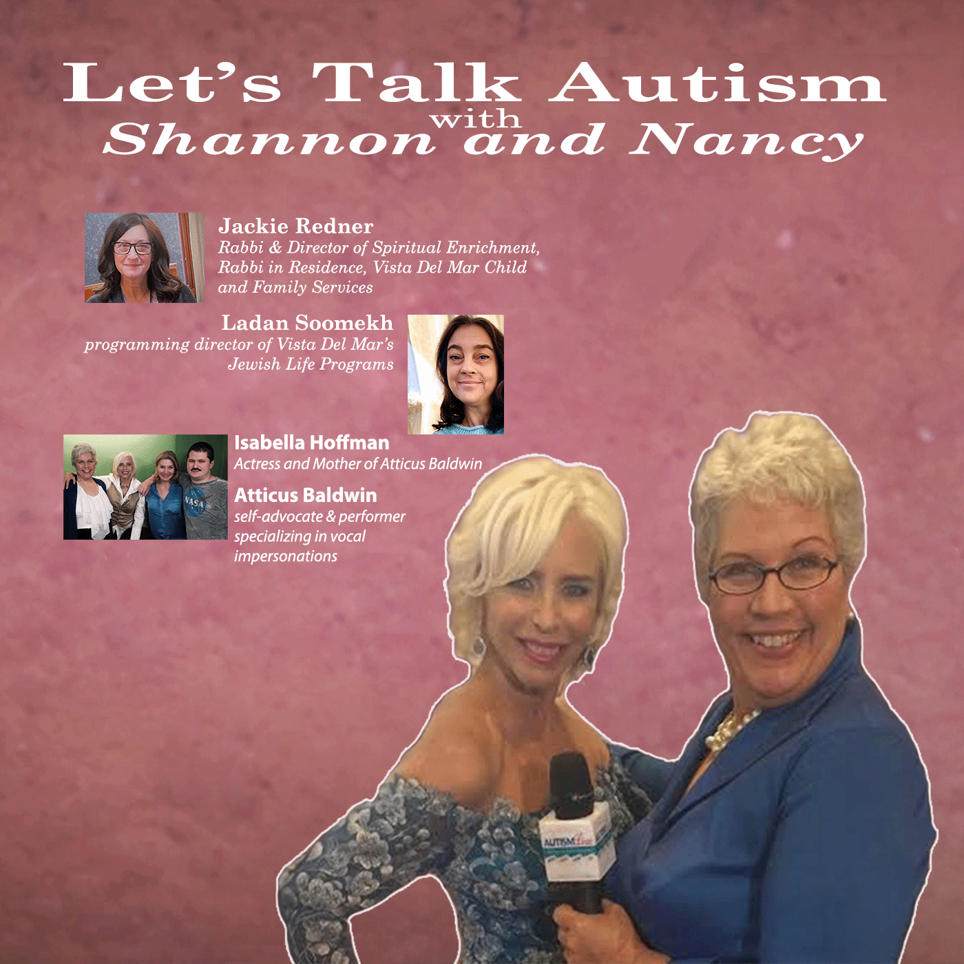 Let\u2019s Talk Autism with Shannon & Nancy is back! Tune in as our hosts Shannon Penrod and Nancy Alspaugh-Jackson 3 autism related news stories before Nancy shows off some of her son Wyatt\u2019s beautiful paintings! Then, we have our joined virtually by Rabbi Jackie Redner, the director of spiritual enrichment and resident Rabbi for Vista Del Mar Child and Family Services and Ladan Soomekh, the Programming director of Vista Del Mar\u2019s Jewish Life Programs. Lastly, we have our first guests in the studio for Let\u2019s Talk Autism since 2020! Actor and Autism Advocate Atticus Baldwin and his mother and fellow performer, Isabella Hoffman, who is best known for her roles on Jag, Dear John, Providence, Beggars and Choosers and pretty much any show that has been on television in the last 20 years everything from ER to Grey\u2019s Anatomy! Jam packed show today! Don\u2019t miss it! Links below!