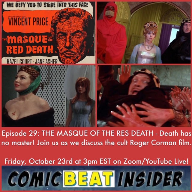 In our 29th episode of COMIC BEAT INSIDER (CBI), Heidi MacDonald (The Beat Chief) and Jimmy are joined by The Beat staff writers Edie Nugent and Ricardo Alejandro Serrano Denis to discuss the cult Roger Corman film THE MASQUE OF THE RED DEATH. Why did Corman adapt the famous Edgar Allan Poe story? Did he stay true to the story? What was the significance of Hop-Toad? How does the film hold up and stay relative? And who did Jimmy pick for his updated modern re-casting? Tune in to find out! As always, a great discussion with an awesome panel! Join us each week to listen in live. Send in topic ideas for future episodes. Be it in comics, TV or film. Also, get a hold of us!