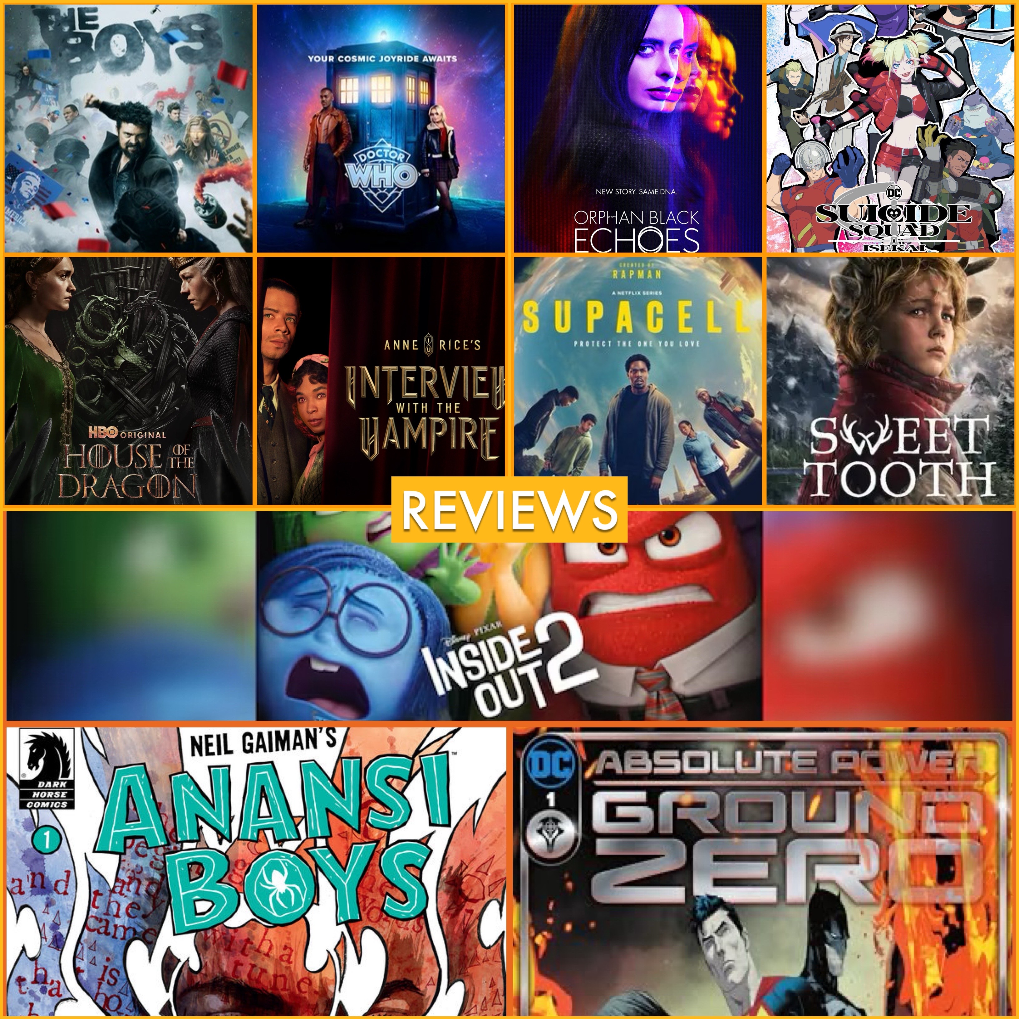 Reviews: The Boys s4, Doctor Who s14, House of the Dragon s2, Interview With the Vampire s2, Orphan Black: Echoes, Suicide Squad Isekai, Supacell, Sweet Tooth s3, Inside Out 2, The Anansi Boys #1, Absolute Power: Ground Zero #1