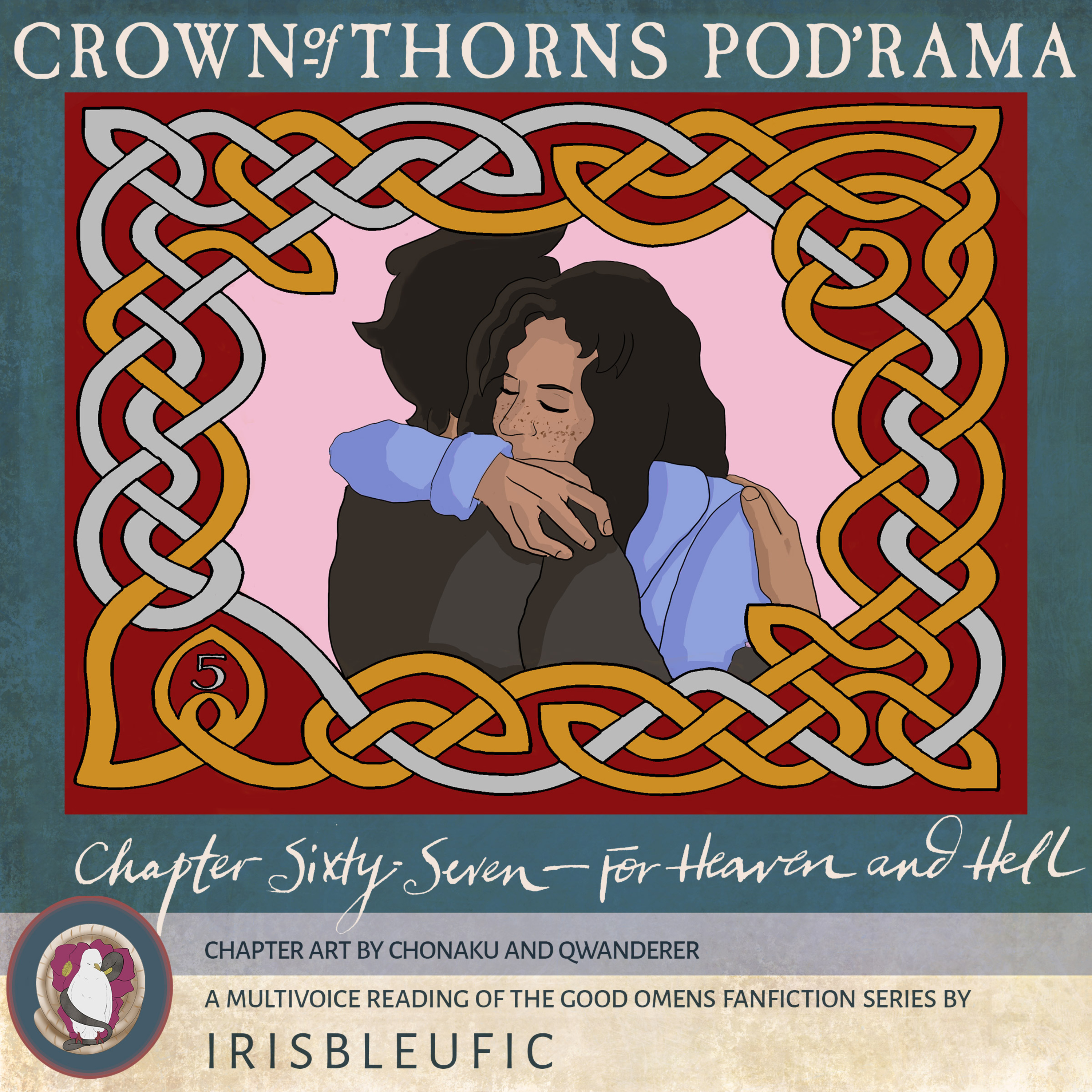 The Crown of Thorns Pod\u2019rama is a dramatic full-cast reading of irisbleufic\u2019s Crown of Thorns [The Walls, the Wainscot, and the Mouse] \u2018Verse, inspired by Terry Pratchett\u2019s and Neil Gaiman\u2019s Good Omens. While there are individual chapters with lower ratings, the Pod\u2019rama is rated Explicit overall.