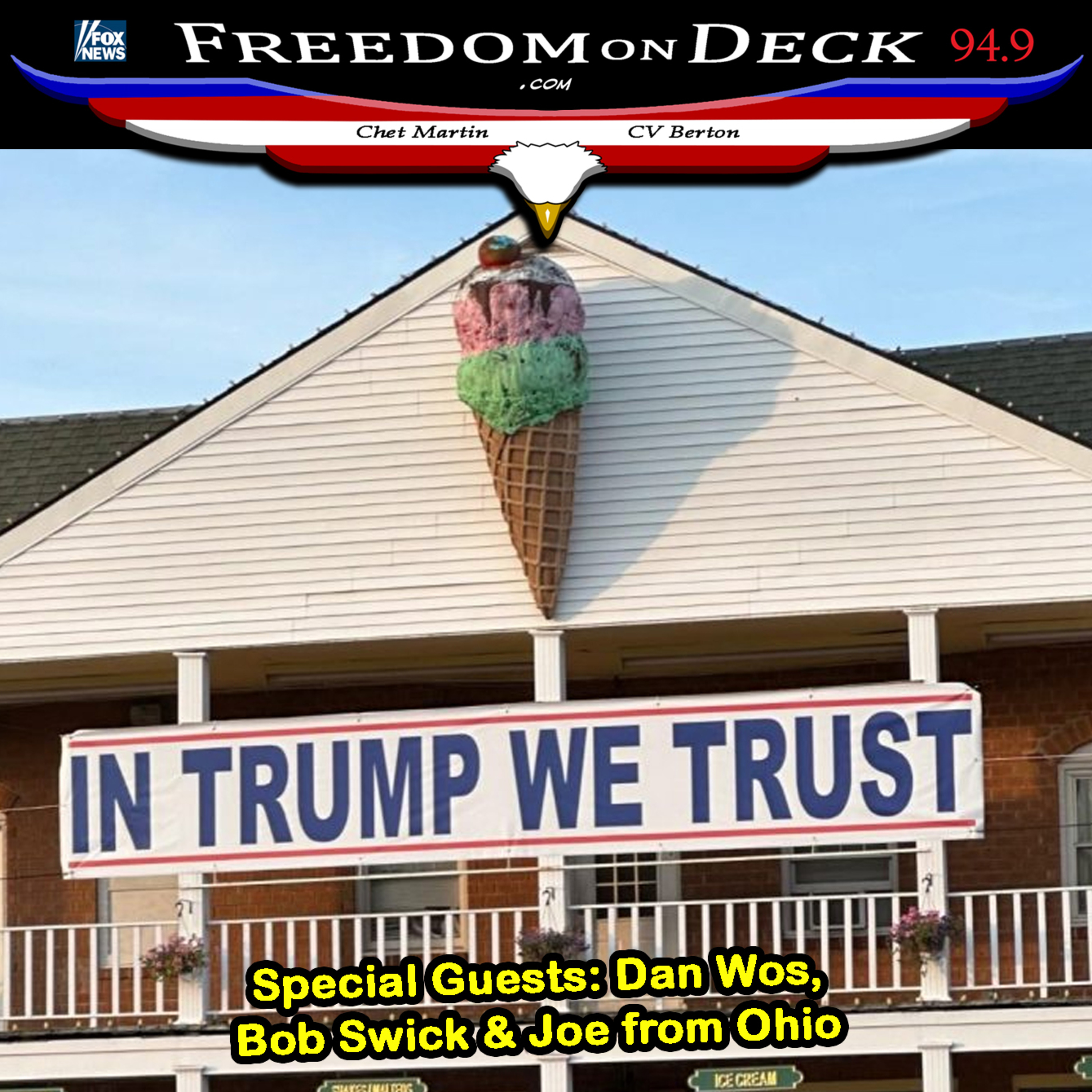 It is not sacrilegious to say, \u201cIn Trump We Trust\u201d. You can trust your mother and God at the same time, right? So we can trust Trump when we know that he kept his promises in his first four years. Guests include Dan Wos, Bob Swick & Joe from Ohio. \nOur live shows can be heard Saturdays from 1:30 to 3pm EST on local radio FM station Fox News 94.9 WJJF - covering Connecticut, Rode Island and Long Island, NY. Listen live from http://freedomondeck.com/ - and find the archives there and on most video platforms, and on Spotify! \nFacebook: https://www.facebook.com/freedomondeck/\nEmail Chet and Brian at FreedomOnDeck@gmail.com\nEmail CV at CVBerton@yahoo.com\nHow to Win Debates: https://cvberton.substack.com/p/how-to-win-debates\nAlpha Eye \u2013 novel by CV Berton available on Amazon: http://bit.ly/AlphaEye