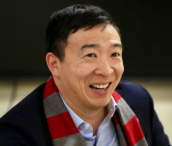 Democratic presidential candidate Andrew Yang, a Phillips Exeter Academy graduate, doesn't share President Donald Trump's political views. But Yang explains why he believes he could surge to the top of a crowded Democratic field like Trump did as the outlier in a large field of Republicans in the 2016 race.