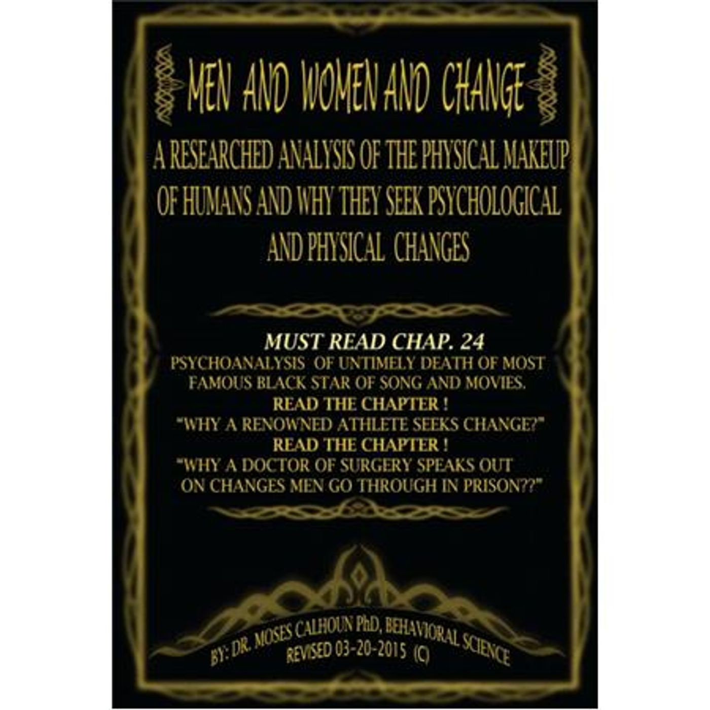 The Contents of his book, "Men And Women And Change"\xa0by Dr. Moses Calhoun, PhD. is a must read for all who can read, and have once been in the womb of their mother. Dr. Calhoun takes a close look at the Biblical account of creation,\xa0and the Scientific findings of Dr. Freud, and interprets them so that the average person on the streets can understand what happened when they were in their mother's womb. Believe and read the book!