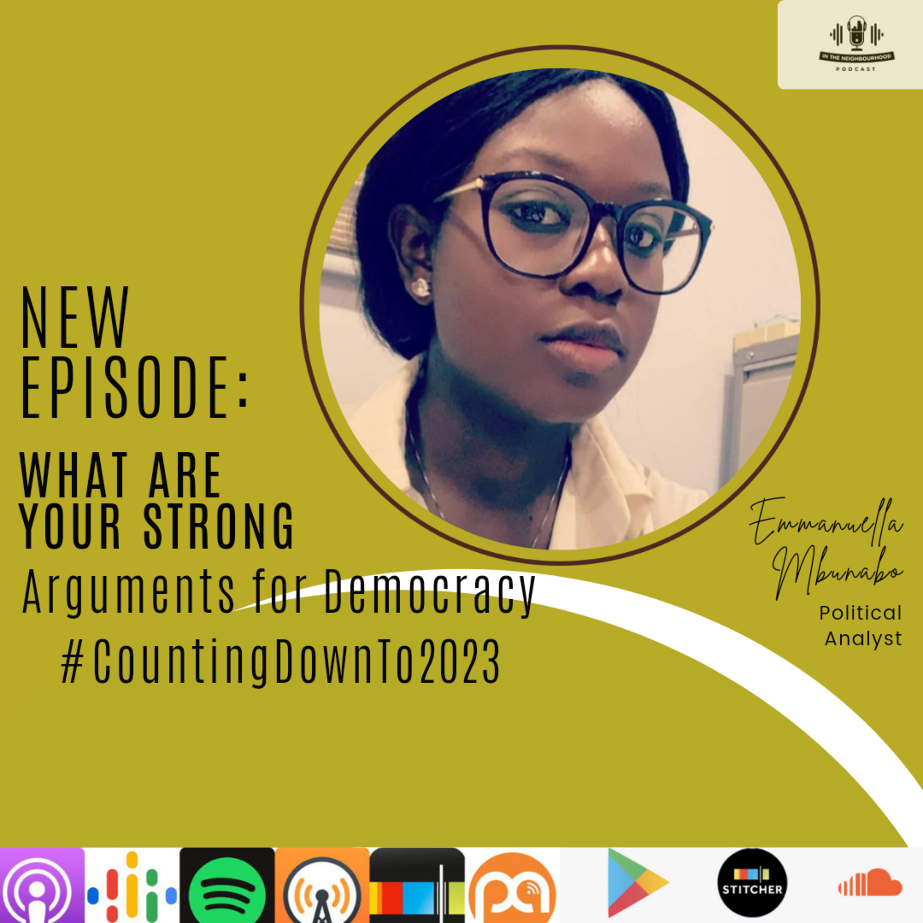 On today's episode, Mbunabo Emmanuella, a Political Analyst undergoing her masters degree in Unilag majoring in Comparative Politics joined us to share her strong arguments for democracy. Her love for the country is palpable as she also shared her opinion on the pending women's rights bills on the floor of the house as well as the Electoral Act Amendment Bill. Listen and remember to leave a voice message with your thoughts. Follow on all social media platforms: Instagram - @intheneighbourhoodpodcast, Twitter - @IntheNhoodPod. If you'd love to encourage us, here's the tip link: https://useshukran.com/cr/intheneighbourhood\n\n\n--- \n\nSend in a voice message: https://podcasters.spotify.com/pod/show/intheneighbourhood/message\nSupport this podcast: https://podcasters.spotify.com/pod/show/intheneighbourhood/support