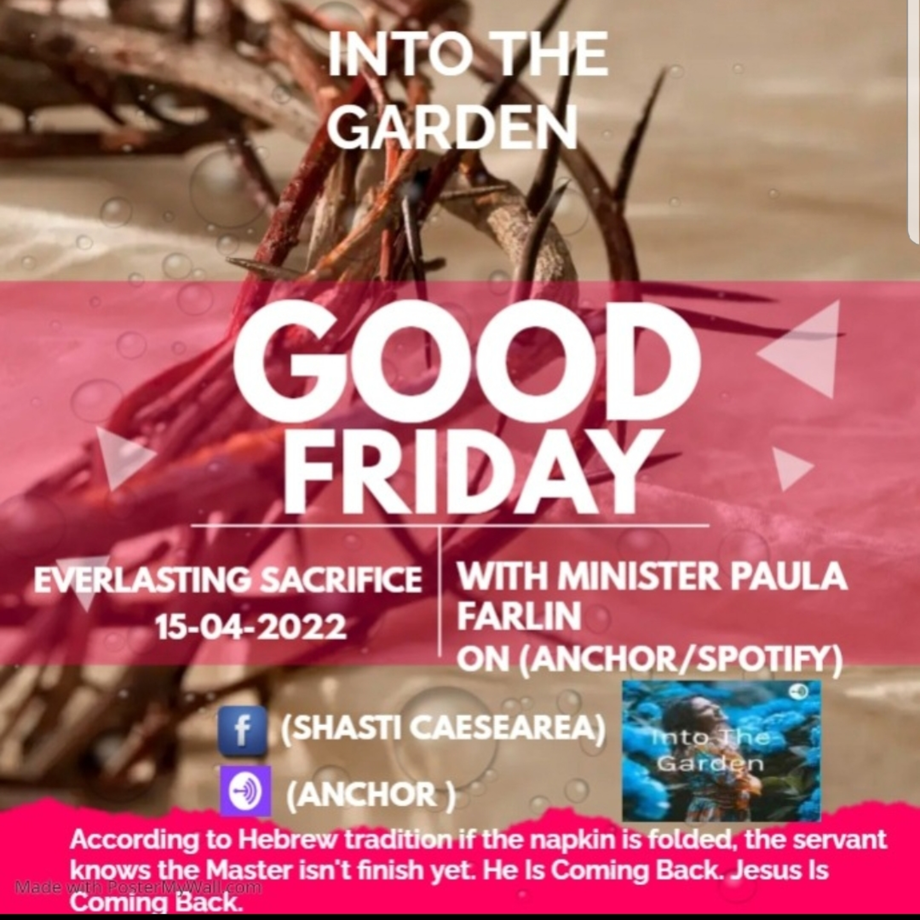 Join Into The Garden and Sassy Soul Friend of God this Good Friday with Minister Paula Farlin bringing a somewhat difference yet beautiful dramatic scene of the cruxifiction in music to you and me. For so many this day remember the 7 words of the Cross and the 7 stations of the Cross, depicting the love Jesus had for you and me, that He took it upon Himself to be a Sacrifice. And as I was preparing myself last night for today I came across an article about why the napkin was folded and found that an interesting read, not knowing that this morning it would be part of the sermon. According to Hebrew custom, if the Master tosses his napkin on the table, then the servant can remove his plate, however if he places the folded napkin beside his plate, then he is returning, in other words, he either got up to answer his phone, open the door or got distracted somewhere, but he is returning. Likewise the folded napkin by Jesus head means, He is returning, He is coming back, so dont give up nor become despondent for Jesus is Alive and living inside you and me. So until next time until we meet again in that auspicious place that trailblazing place that bless me place where the muderer says remember me. So have an awesome weekend until we meet greet connect and say thanks be to God. \n\n--- \n\nSend in a voice message: https://podcasters.spotify.com/pod/show/into-the-garden/message