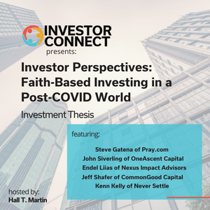 This is Investor Perspectives. I\u2019m the host of Investor Connect, Hall T. Martin, where we connect startups and investors for funding. In our new Investor Perspectives series entitled \u201cFaith-Based Investing in a Post-COVID World\u201d, you\u2019ll hear our guests\u2019 investment thesis.\xa0\xa0 As the COVID pandemic passes, we emerge into a new era. The faith-based investing space is now undergoing tremendous change as we shift to a post-COVID world. Faith-based investing takes precedence with many investors in the financial industry. We have investors and startup founders describe the changes coming up. Our guests are: , Founder and CEO, [01:25], Director of Private Markets, [03:53], Founder and Managing Principal, [06:41], CEO, [10:19], CEO, [12:25] We hope you enjoy the show. ________________________________ For more episodes from Investor Connect, please visit the site at: \xa0\xa0 Check out our other podcasts here: \xa0\xa0 For Investors check out: \xa0\xa0 For Startups check out: \xa0\xa0 For eGuides check out: \xa0\xa0 For upcoming Events, check out For Feedback please contact info@tencapital.group\xa0\xa0 Please , share, and leave a review. Music courtesy of .