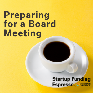 Hello, this is Hall T. Martin with the Startup Funding Espresso -- your daily shot of startup funding and investing. For board meetings, it\u2019s important to prepare properly. Set the meeting schedule well in advance, such as a year. Prepare documents far enough in advance so the members have time to read the materials and prepare for the meeting. Use a standard format for the board package so the members can find things more easily. Use the board package to give the status updates and focus the meeting on the key decisions to take. Set up the meeting agenda to cover the most important topics first. Include the company financials including cash position. Include a slide deck for the talking points. In crisis situations, you may need to call additional board meetings such as when the company runs out of cash unexpectedly or gets hit with a lawsuit.\xa0\xa0\xa0\xa0\xa0 Thank you for joining us for the Startup Funding Espresso where we help startups and investors connect for funding.Let\u2019s go startup something today.____________________________________ For more episodes from Investor Connect, please visit the site at: \xa0 Check out our other podcasts here: \xa0 For Investors check out: \xa0 For Startups check out: \xa0 For eGuides check out: For upcoming Events, check out \xa0 For Feedback please contact info@tencapital.group
