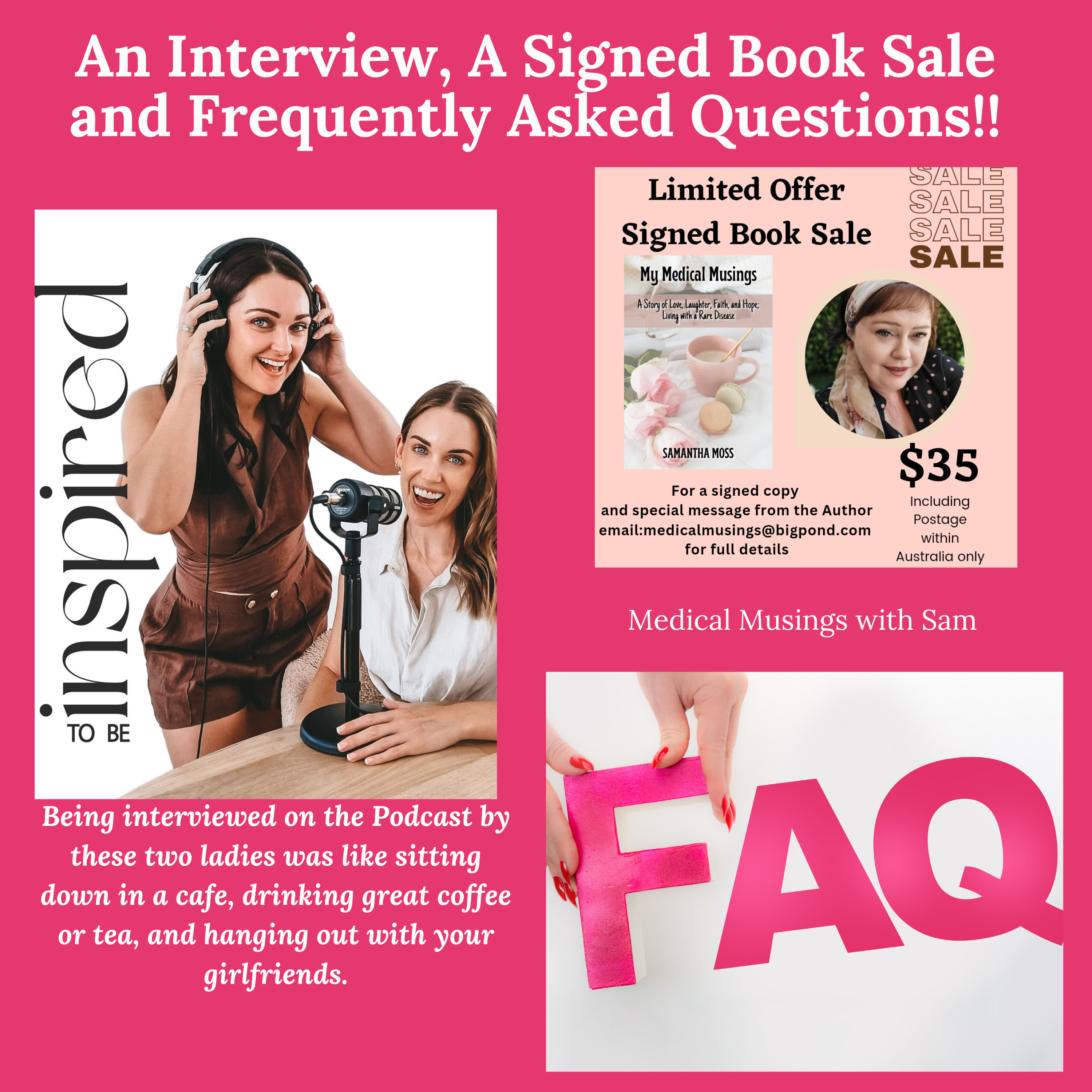This is a slightly different Podcast episode....you could say it's three for the price of one!\n\nI'm introducing you to an amazing podcast ,"Inspired To Be," hosted by two beautiful, inspiring, and talented young ladies, Sammy Wynn and Elise Ingegneri. I was honoured to be a Guest on their show, and as promised, here is the link to the interview which was published this week:\nhttps://open.spotify.com/episode/7jgnGSXev5tu9ALurJGgN8?si=IunBjDPzR3q4PvaRmXl0_g\n\nThe second part of this Podcast is a Virtual Book Launch by way of a special Signed Copy Book Sale. All the details are in the Podcast but for basic information here is a link from my blog:\nhttps://mymedmusings.com/2023/08/10/dont-miss-out-on-our-exclusive-signed-with-a-special-message-from-sam-book-sale/\n\nLastly, but not least I answer some Frequently Asked Questions I have received over the years since I started blogging and had my book published. I hope you enjoy this segment. I mentioned a particular blog post as part of this FAQ segment called "A Case of Chronic Illness Overload" and I promised to link it here:\nhttps://mymedmusings.com/2020/01/11/a-case-of-chronic-illness-overload/\n\nThank you for listening everyone. I really hope you enjoy this very different episode.\n\nTake care,\nSam xx \U0001f618