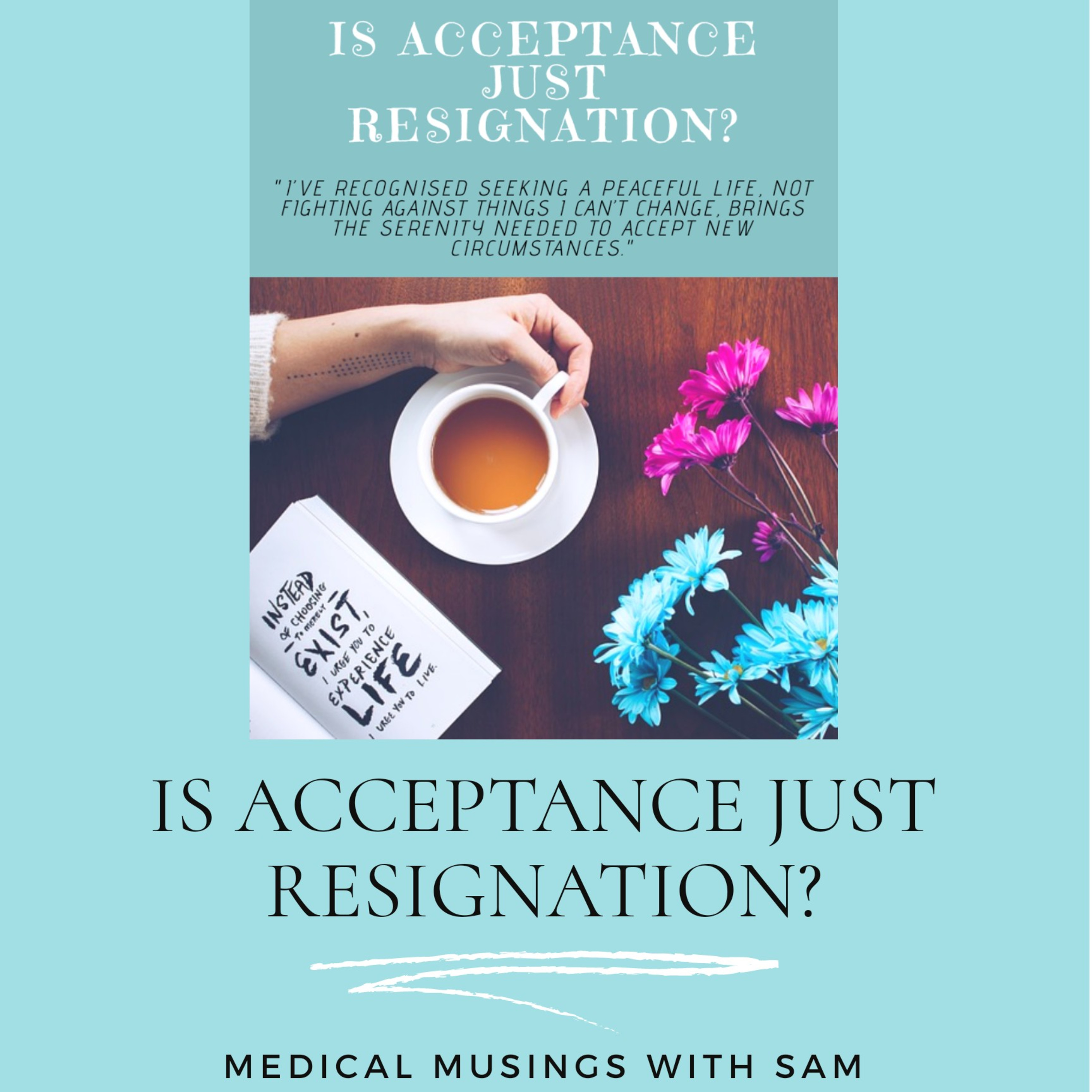 A friend recently posted a question in a Facebook Group, about ways to gain freedom in life, so you can choose how you want to live it.\n\n\u201cWhat has most helped you to gain freedom in your life to choose exactly how you want to live it?\u201d.\nMy response was one word.\nAcceptance.\nOf course I had to follow through with a short sentence because I really can\u2019t stop at one word!\nAcceptance brings me peace and freedom.\nAfter posting my response, I pondered about whether acceptance was just a state of resigning myself to living with the shackles of my chronic disease. Or was it more than that?