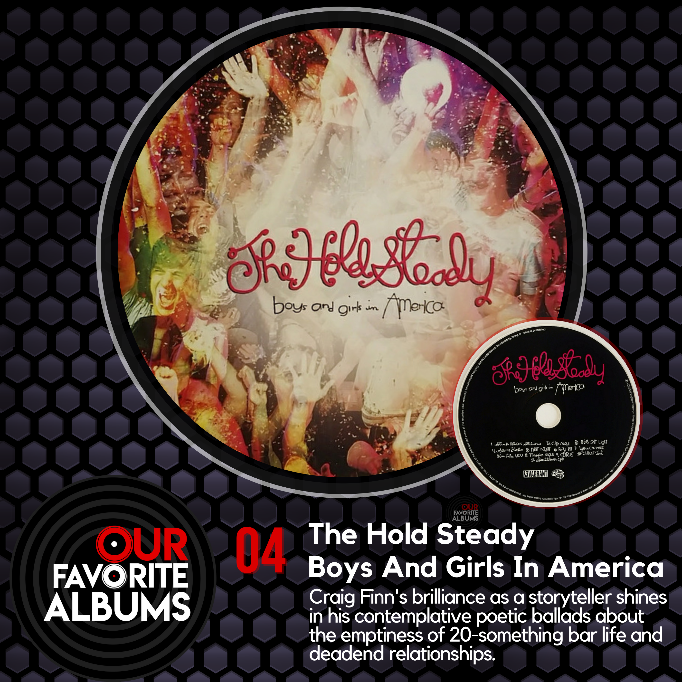 The art of storytelling in American lore tends to follow a character who starts at the bottom and ends up making it all the way to the top.\xa0 That\u2019s the story of the America Dream!\xa0 Our society loves that fairy tale so much and was so prevalent throughout the early part of our history.\xa0\n\nHowever, during the 50s and 60s, the storytelling in America went thru a radical evolution and suddenly highlighted the tragic and the sad ending.\xa0 What happens when the characters in the story find themselves withering away on a dead-end street going nowhere in a dead-end town?\n\nIn this episode, we are talking about a great American tale about the backside of barlife, where goodtimes and party anthems slowly devolve into emptiness and desperate single-serving relationships.\xa0 This is the 2006 album Boys and Girls In America by The Hold Steady, one of our favorite albums.\nListen In Your Browser\n\n\nListen On Your Favorite Podcast Provider\n\n \t \ticon-itunes\t\t\t\nApple Podcasts\n\n\n\n\n\n\n.s{fill:none;stroke:#181413;stroke-linecap:round;}\n\t\t\t\nSpotify\n\n\n\n\n\n\n.pill{fill:none;stroke-width:4;stroke-linecap:round;}\n \t \t \t \t \t \t \t \t \t \t \t \t \t \t \t \t \t \t\t\t\t\nGoogle\n\n\n\n\n\n\n\n\t.st0{fill:#14D8CC;}\n\n\n\n\t\t\n\t\n\n\nTuneIn\n\n\t\t\t\nStitcher\n\niHeartRadio logo\t\t\t\nIHeartRadio\n\n\t\t\t\nAndroid\nHear\nThe Hold Steady\nBoys and Girls In America\n\nThe Hold Steady - Boys And Girls in America\n\n\nShow Notes & Meta\n\n\t\t\t\t\t\t\t\t\n\n\nhttps://www.youtube.com/watch?v=2ENVH-pgLR0https://www.youtube.com/watch?v=aMwsadlUHCEhttps://www.youtube.com/watch?v=yuVmjv22Nqchttps://www.youtube.com/watch?v=QWveXdj6oZU