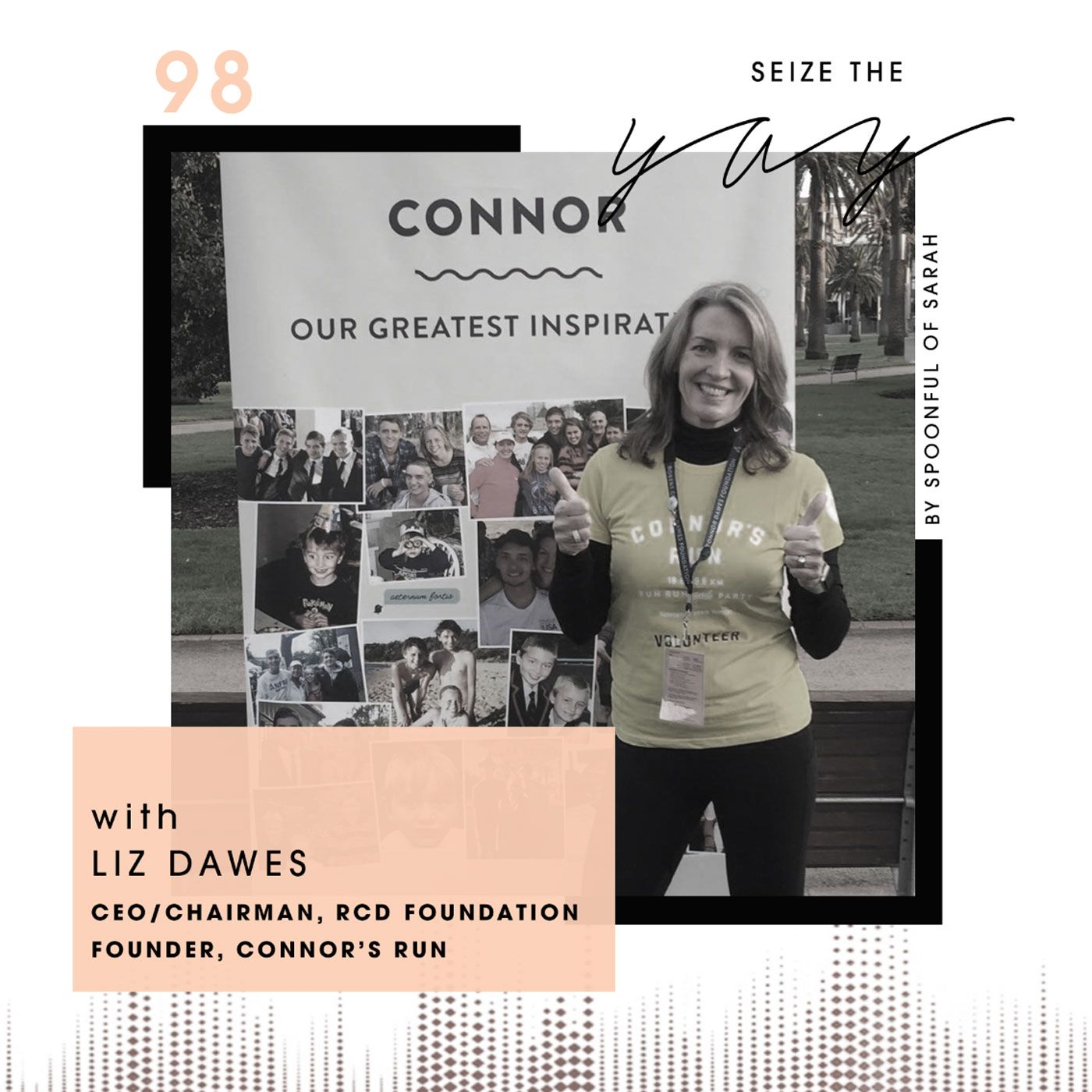 This week\u2019s episode is another one of many that\u2019s been shuffled around and pushed back for various reasons, but that has ended up coming out just when I think our guest\u2019s insights are most powerful. A big part of seizing your yay is acknowledging that both the best and worst times of our life play a role in our journey and If we ever needed some guiding words on turning adversity, uncertainty and grief into something positive, Liz Dawes is your woman.\n\nLike many of our guests, I loved diving into her earlier years because she had an entire life and career going from a small town in Wisconsin to travelling the world leading multi-million-dollar sales and marketing accounts BEFORE the chapter most of us know her from now as an adopted Melbournian and internationally recognised CEO and Chairman of a charitable foundation. Liz and her husband Scott had their world turned upside down when their son, Connor, was diagnosed with paediatric brain cancer \u2013 the #1 disease killer of young people \u2013 and passed away a few years later. We discuss the many different ways people process grief and how just a few short months later, Liz held the first Connor\u2019s Run founding the Robert Connor Dawes Foundation which is now the biggest paediatric brain cancer foundation in Australia. As she puts it in her TEDx talk last year, Liz reframed, reimagined and reaffirmed her way forward and has now raised $7million impact dollars that\u2019s helping fund research, care programs and so much more. Parts of this one are heavy but incredibly meaningful and with a beautiful happy ending (or happy beginning that's now eight years in) \u2013 I hope you are as moved as I am by Liz and the beautiful legacy she has created for Connor.\n\nSIGN UP TO CONNOR'S RUN 2020 HERE\n\n+ Follow RCD Foundation here\n+ Announcements on Insta at @spoonful_of_sarah\n+ Join our Facebook community here\n+ Subscribe to not miss out on the next instalment of YAY!