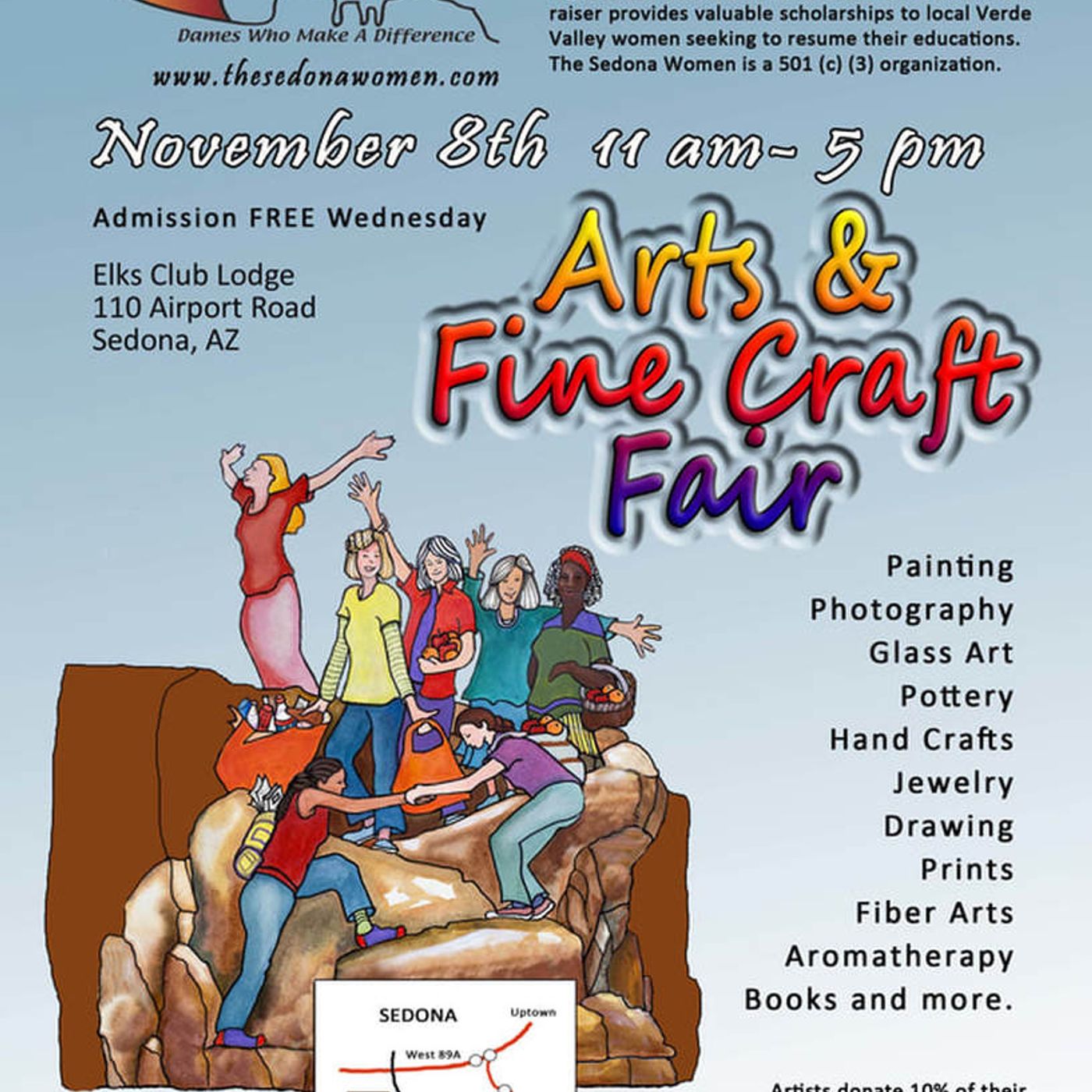 \xa0\xa0CHECK OFF THAT HOLIDAY GIFT LIST EFFORTLESSLY ON WEDNESDAY, NOVEMBER 8TH\xa0FROM 11:00 A.M. TO 5:00 P.M. AT THE SEDONA ELKS CLUB.\xa0 THE SEDONA WOMEN WILL DAZZLE YOU WITH AN ARRAY OF ART AND FINE CRAFTS FOR EVERY BUDGET. \xa0GIFT BUYING WILL BE EASY AND FUN THIS YEAR. \xa0PROCEEDS WILL FUND \xa0SCHOLARSHIPS FOR VERDE VALLEY WOMEN SEEKING TO RESUME THEIR EDUCATION.\xa0 JUST THINK: YOUR GIFTING REALLY GIVES TWICE! ADMISSION IS FREE, SO JUST COME, SHOP, AND JOIN THE FUN. \xa0FOR MORE INFORMATION GO TO\xa0WWW.THESEDONAWOMEN.com\xa0.