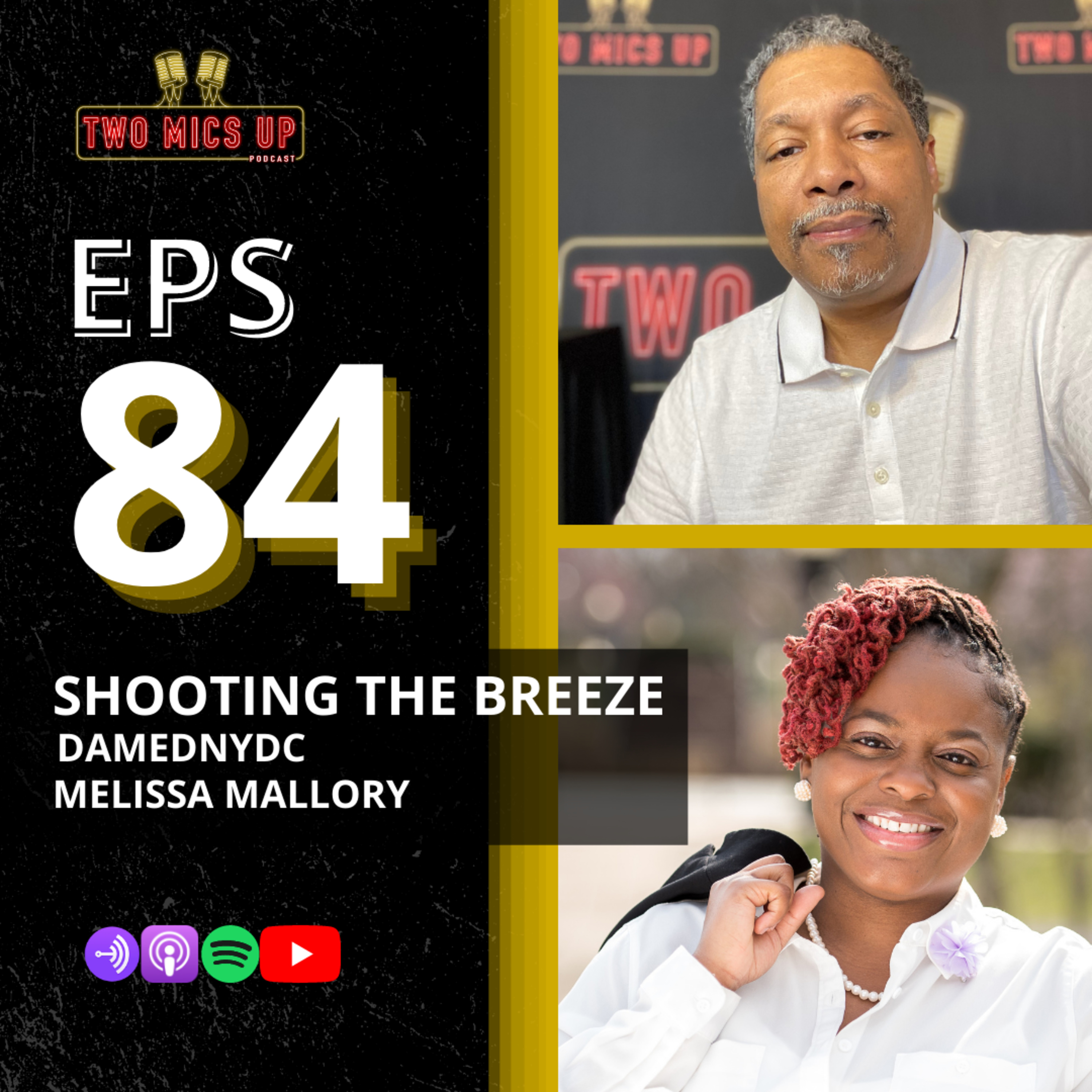 Eps. 84: Today on Two Mics Up damednydc and and featured guest co-host Melissa Mallory sit back and have some fun Shooting The Breeze! They both have some fun peeling back the layers on who they are as people, their backgrounds coming up and really want to allow you our amazing audience an opportunity to get to know them better.