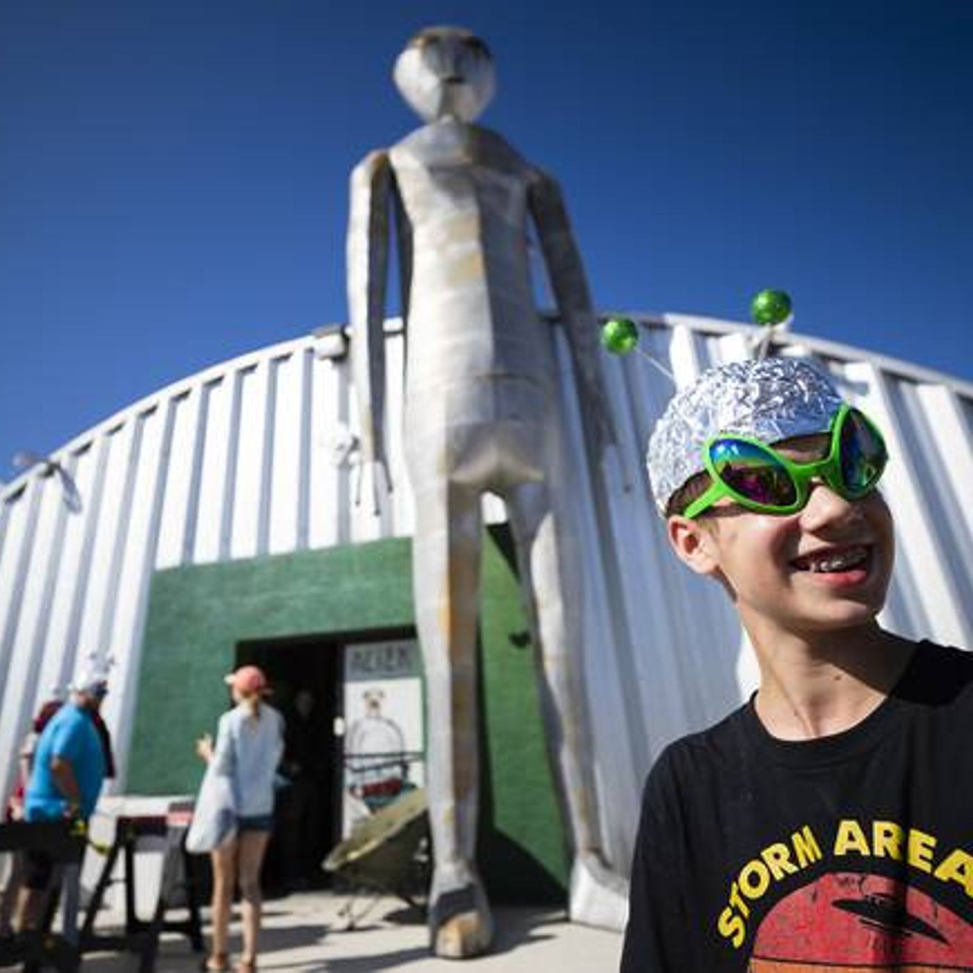 Noah Davenport, 13, stands in front of the Alien Research Center during the Storm Area 51 Basecamp event in Hiko, Friday, Sept. 20, 2019. Earlier in the day, Noah reached his hand across the Area 51 gate.