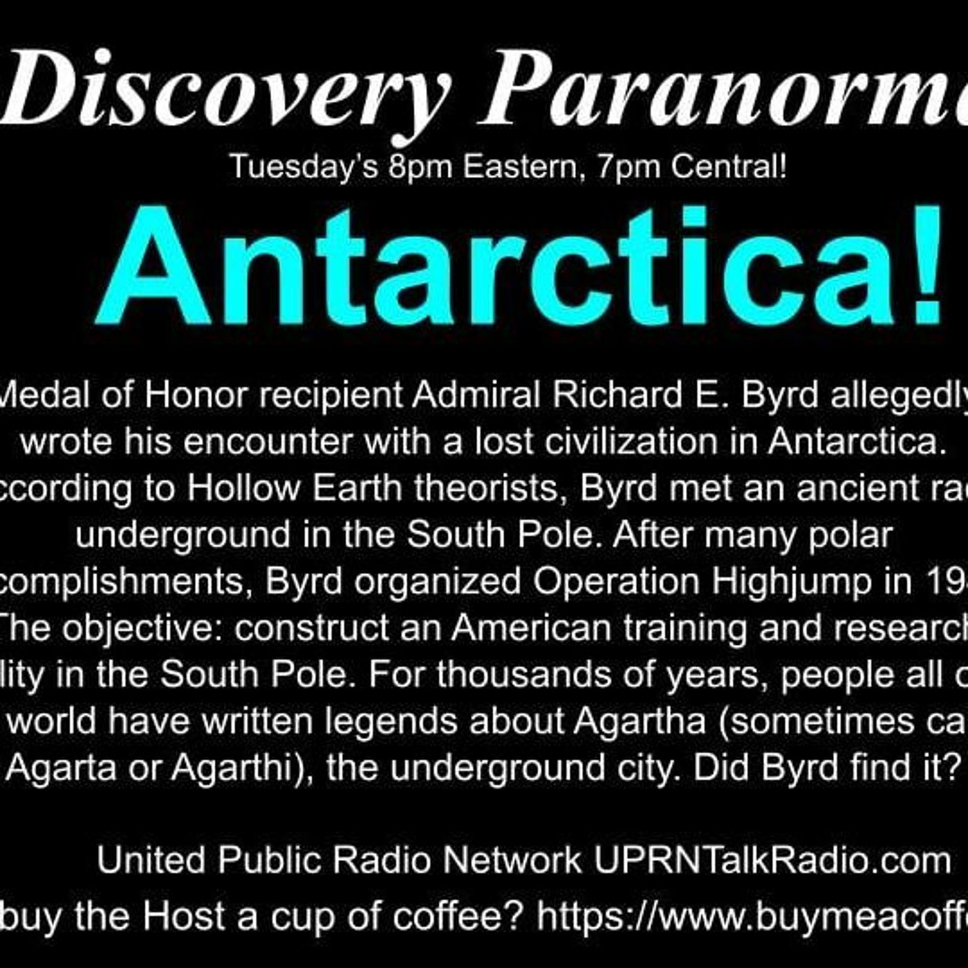 Discovery Paranormal August 10th 2021: ANTARTICA! Medal of Honor recipient Admiral Richard E. Byrd allegedly wrote his encounter with a lost civilization in Antarctica. According to Hollow Earth theorists, Byrd met an ancient race underground in the South Pole. After many polar accomplishments, Byrd organized Operation Highjump in 1947. The objective: construct an American training and research facility in the South Pole. For thousands of years, people all over the world have written legends about Agartha (sometimes called Agarta or Agarthi), the underground city. Did Byrd find it?