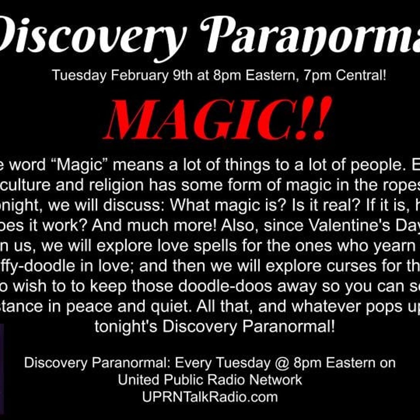 Discovery Paranormal The word “Magic” means a lot of things to a lot of people. Every culture and religion has some form of magic in the ropes. Tonight, we will discuss: What magic is? Is it real? If it is, how does it work? And much more! Also, since Valentine's Day is upon us, we will explore love spells for the ones who yearn to be daffy-doodle in love; and then we will explore curses for those who wish to to keep those doodle-doos away so you can social distance in peace and quiet. All that, and whatever pops up on tonight's Discovery Paranormal!
