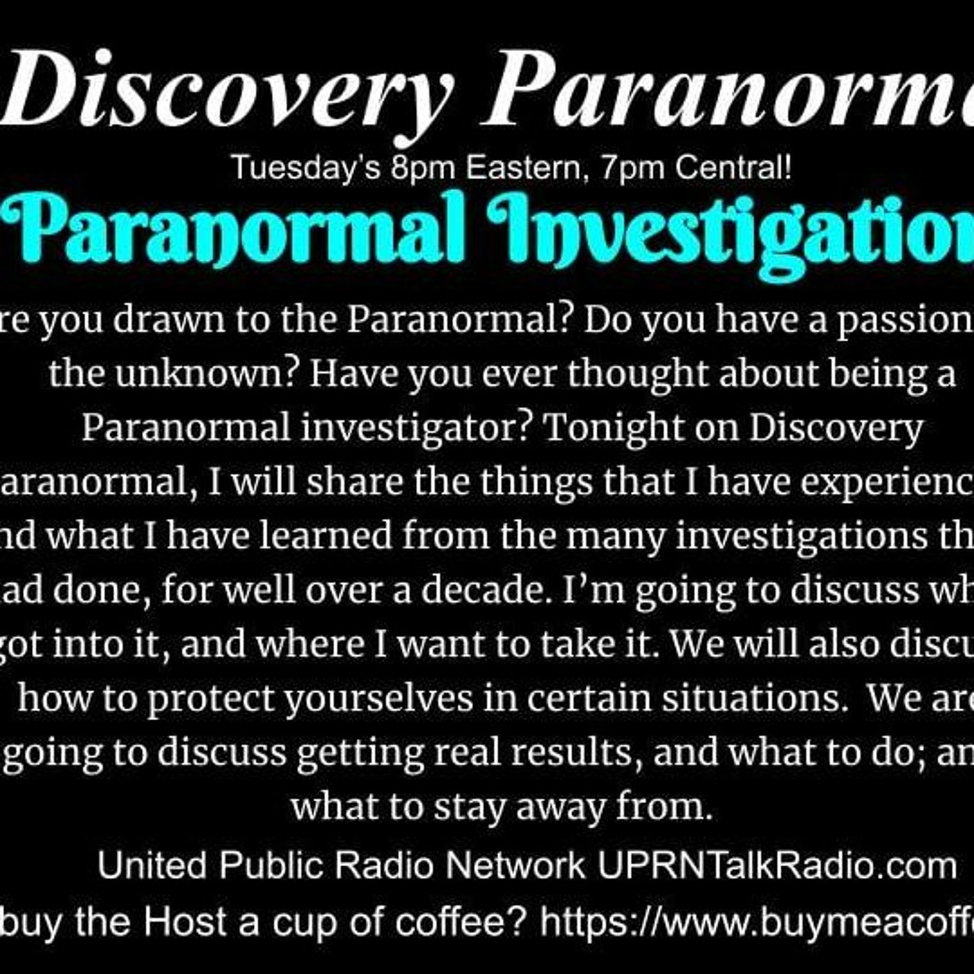 Discovery Paranormal, July 13th 2020, Paranormal Investigation: Are you drawn to the Paranormal? Do you have a passion for the unknown? Have you ever thought about being a Paranormal investigator? Tonight on Discovery Paranormal, I will share the things that I have experienced, and what I have learned from the many investigations that I had done, for well over a decade. I’m going to discuss why I got into it, and where I want to take it. We will also discuss how to protect yourselves in certain situations. We are going to discuss getting real results, and what to do; and what to stay away from.