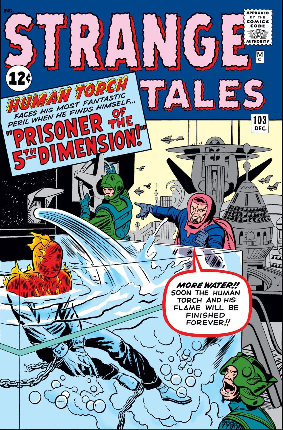 Houses in Glenville are sinking into the ground and no one knows why. Johnny Storm, the Human Torch, who lives in Glenville, calls Reed Richards for help and is told to figure it out on his own. Some teammate. And so Johnny investigates and is at a loss for these strange occurrences. He returns at night and sees aliens using a ray gun on a house, which causes it to sink into the ground. He confronts one of the aliens and is transported to their dimension, the Fifth Dimension. There, he meets the overlord of the Fifth Dimension, Zemu, and is swiftly imprisoned. A group of dissidents free Johnny, and he inspires the people to rise up against Zemu. Johnny then returns to Earth and the life of an ordinary high school student (whom everyone must know is “secretly” the Human Torch).