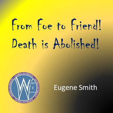 Death is the enemy of God and all mankind. The resurrection of Jesus has abolished death, stripped it of its power and fear. Between now and the coming of Jesus, it is a friend to the believer. At the appearing of Jesus, it will cease to exist! What a change of perspective this gives to the life which we now live! Hope overflows us as we anticipate the future! The world is a different place - there is a new king upon the throne!