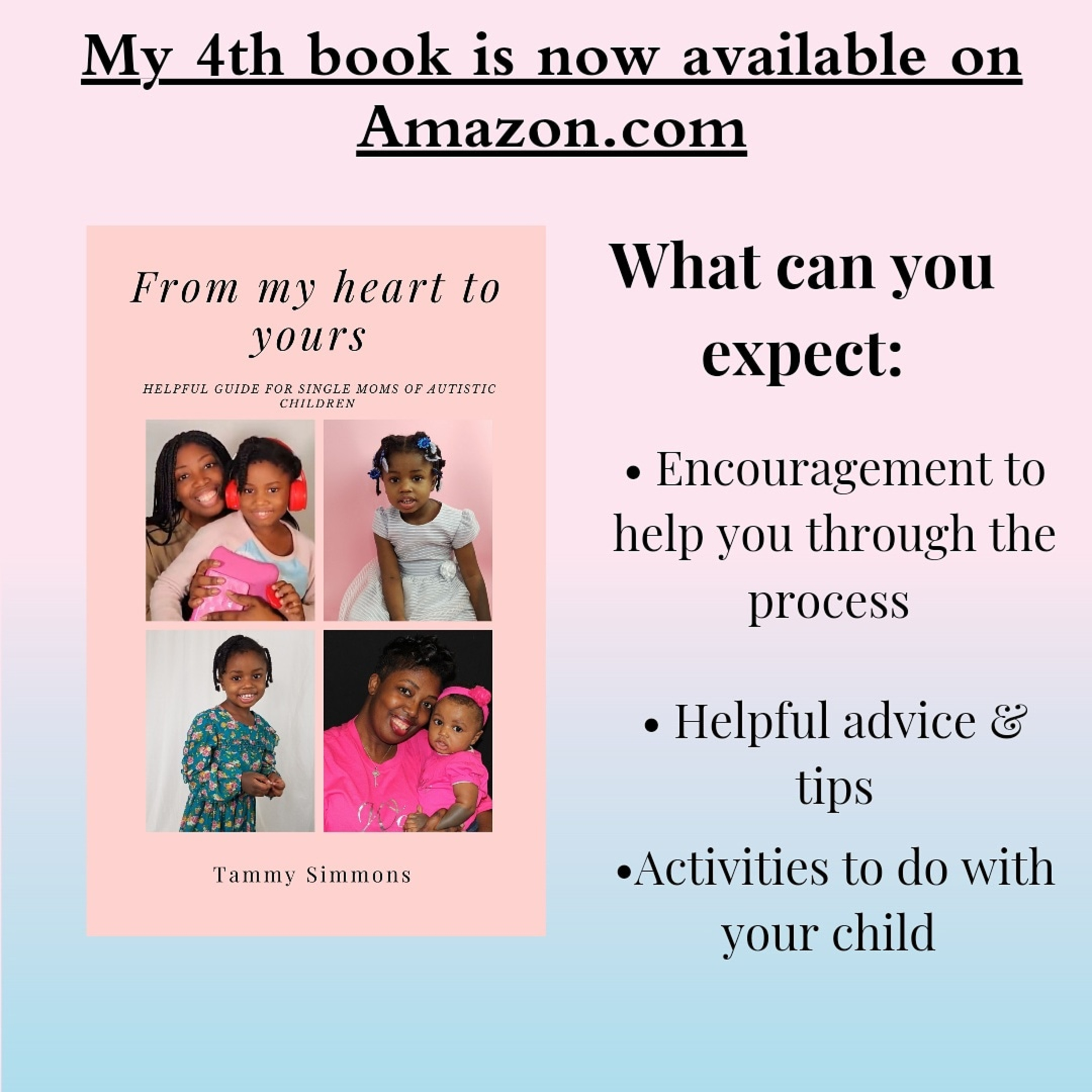 In this Podcast I talk about my 4th book that is available right now on amazon.com called: From my heart to yours, a helpful guide for single moms of children with autism. And I also give you encouragement if you happen to be a mom or parent of a child that has autism\n\n--- \n\nSupport this podcast: https://podcasters.spotify.com/pod/show/worthyworthitpriceless/support